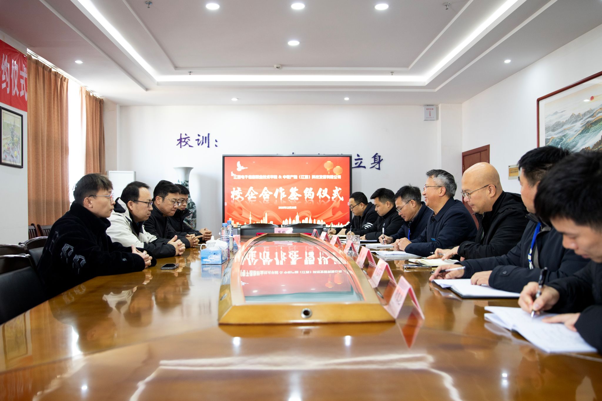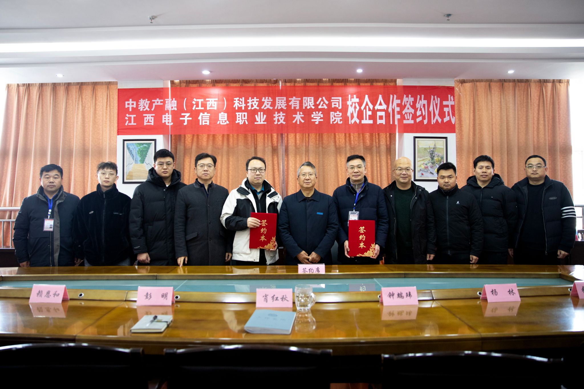 12月25日,江西电子信息职业技术学院与中教产融(江西)科技发展有限公司校企合作签约仪式在高新校区顺利举办。中教产融(江西)科技发展有限公司执行董事王昌威、经理李礼,学校党委书记肖红秋、副院长彭明、党委委员、副院长钟端玮,以及招生就业处、文化创意学院相关负责人和教师代表共同出席仪式,见证双方深化产教融合、共促协同育人的重要时刻。