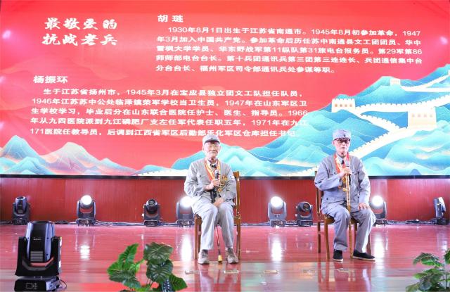 诗会特别邀请两位年逾九旬的抗战老兵胡琏、杨振环亲临现场。他们以亲身经历讲述烽火岁月的革命故事,带领观众穿越时空,重温峥嵘历程。老兵们坚毅的目光与铿锵的话语,让在场师生深刻感受到“一寸山河一寸血”的家国情怀,掌声数次响彻全场。