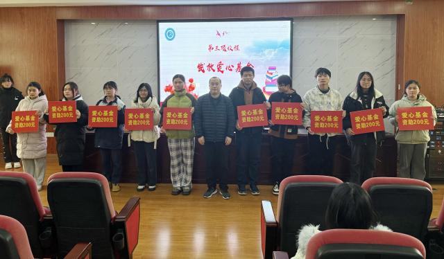 2025年1月8日下午,学校团委在五楼阶梯教室组织开展一年一度“爱心基金”发放仪式,及时传递学校的关怀与慰问。学校纪委书记江耀武出席仪式并为学生发放爱心基金,班主任代表和127名受助学生参加活动。